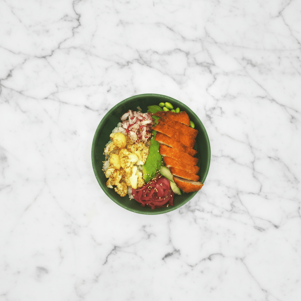 Sushi ris, avocado, edammebønner, agurk, friteret blomkål, rødløg, kina radiser, ingefær, sesam, laks og pankopaneret rejer