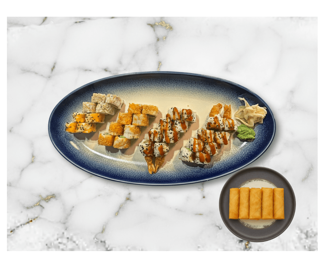4 stk California maki, 4 stk Ebi suteki maki, 8 stk Spicy laks maki 8 stk Crispy ebi maki, 8 stk Ebi tempura maki